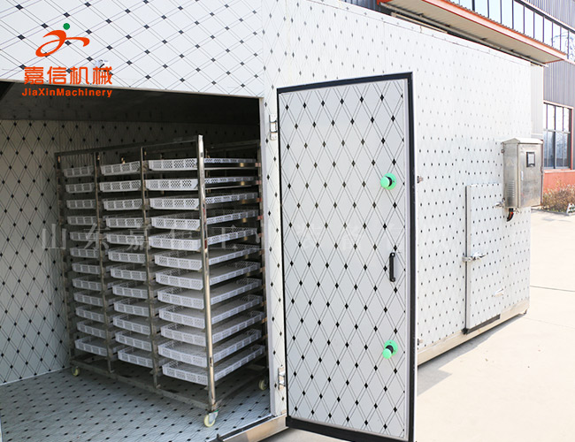 首先將脫青皮8小時後的核桃推入烘房,溫度控製在高達30-35℃烘12小時個,過程中注意排濕(shī),果殼表麵水分散(sàn)失,顏色由黑褐轉為褐色時排濕結束。 此後升溫到 45-50℃烘(hōng)烤12小時(shí)特,征(zhēng)為敲開核果後果內無水汽,仁已定色,七成幹。後溫度控製在30℃,約16個小時即可,含水量達10%左右。堅(jiān)果相互碰撞時,聲音脆響,橫隔膜易折斷,核仁酥脆。在常溫下,相對濕度60%的堅果平均(jun1)含水量為8%,核仁約4%,便達到幹燥指標。